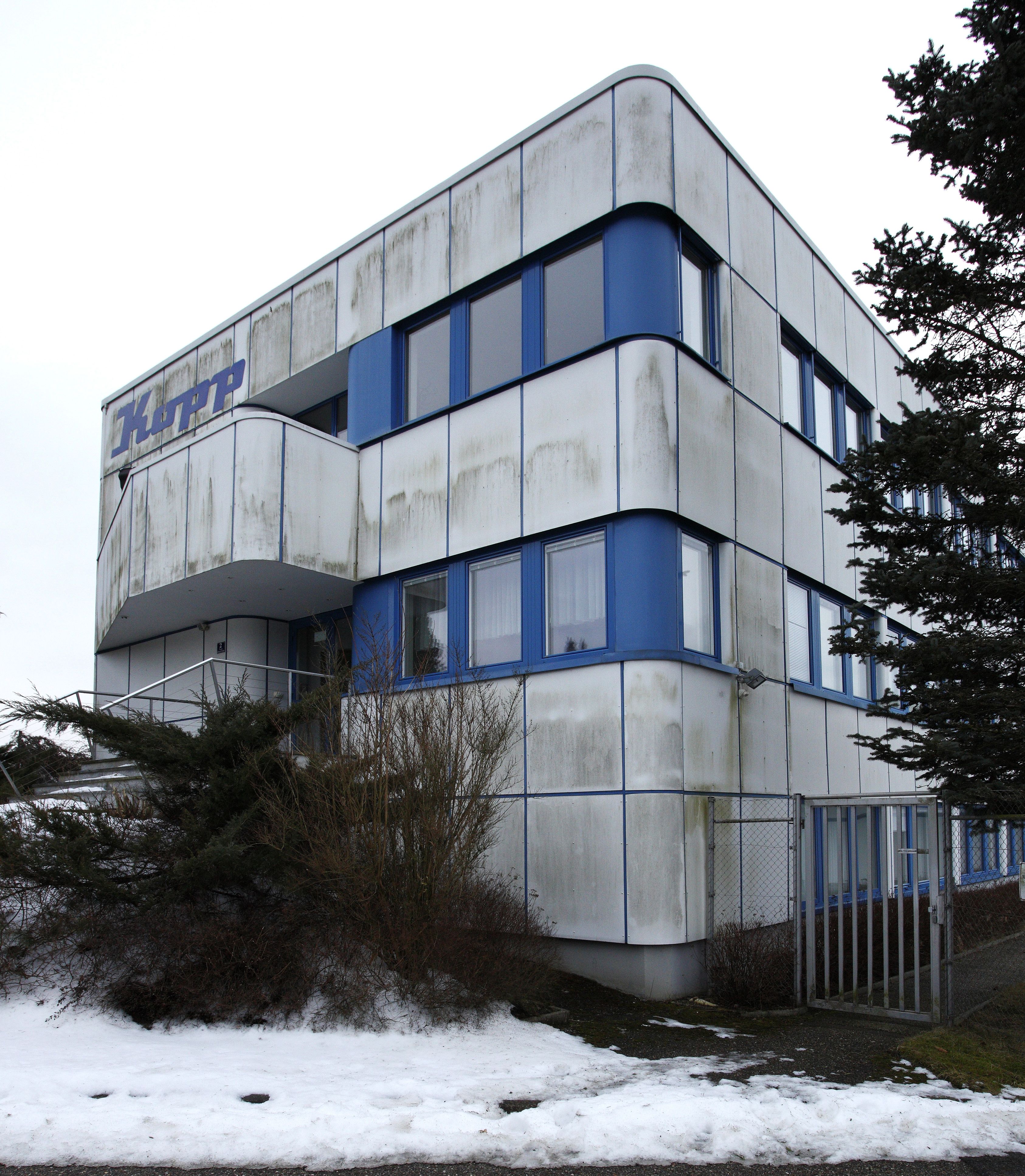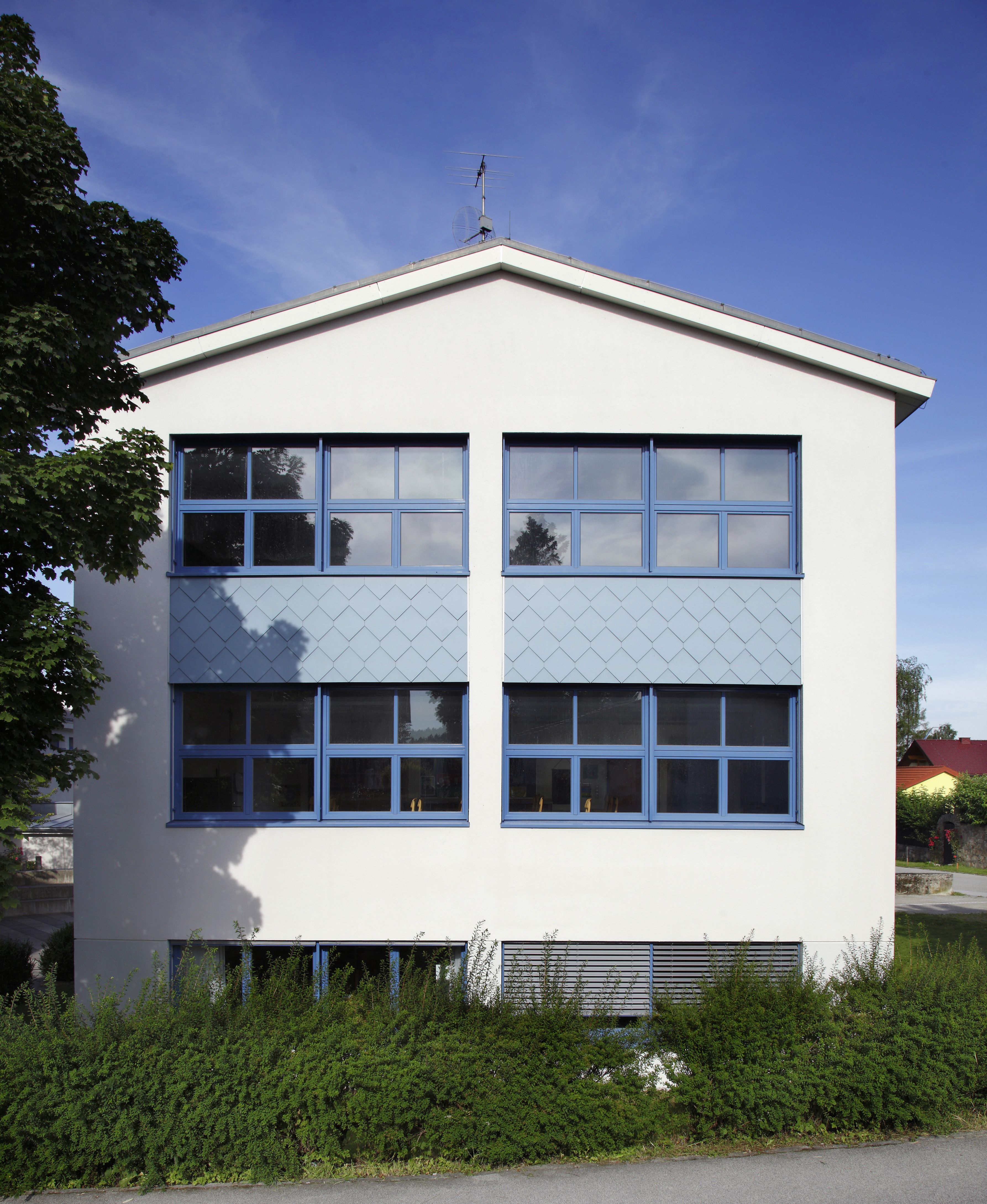 zu sehen: links vor, rechts nach Eternit- und Blechfassadenreinigung